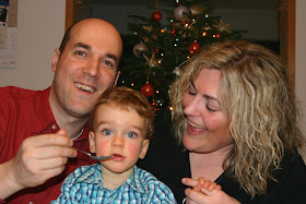 Cu ocazia asta, printre salata de boeuf, sarmale si tarta de fructe, am apucat si noi sa ne facem reciproc oarece poze de familie... Am gasit cateva acceptabile, desi dragalasul de David nu a stat cuminte la pozat precum Ala, el era permanent mai interesat de salata de boeuf si de sarmalele de pe masa (din care s-a infruptat si el - dealtfel a mancat si ceva varza murata in timp ce faceam sarmalele, asa ca...).
